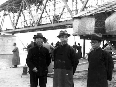 茅以升(左)、曾养甫(中)、罗英(右)在钱塘江大桥施工现场