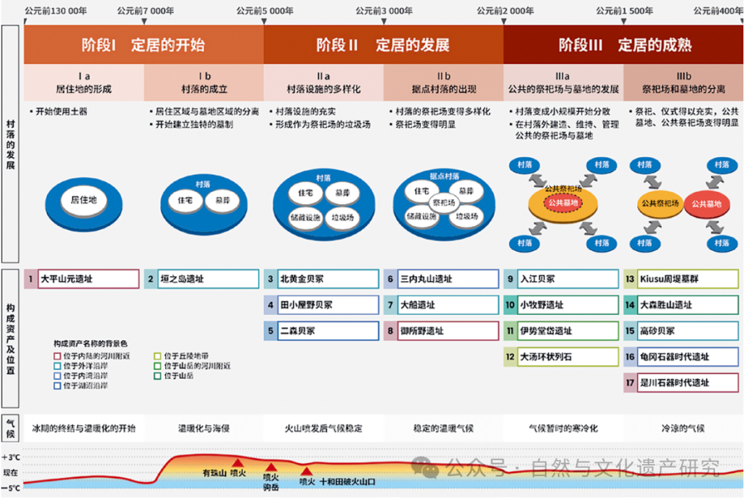 虽然2006年青森县和秋田县分别提出将所在县域内主要或最具特色的绳纹遗址群列入《世界遗产备选名单》的提案,但是并未直接通过;次年,北海道、青森县、秋田县、岩手县联合以“北海道和北东北的绳纹遗址群”为主题继续申请,2009年稍作更名的“北海道和北东北为中心的绳纹遗址群”从全日本数万处绳纹遗址中确定了15处,列入《日本世界遗产备选名录》,从此申遗活动加速进行。在后续的申遗过程中,为了更加真实和完整地体现上述价值,遗产点选择几经变化,2012年增加了年代非常关键的垣之岛遗址(图8)、类型特别的Kiusu周堤墓群和内涵不断丰富的大森胜山遗址共计3处,增至18处;2015年又去除鹫之木遗址(图9)和长七谷地贝冢2处,减至16处,主要原因是2处遗址的保存问题;2016年,位置极为临近且作为一处史迹的入江·高砂贝冢被分为2处,以对应定居成熟阶段a和b两小阶段,前一年去除的2处作为关联资产继续支撑对于绳纹文化的理解。最终形成的17处遗产构成,兼顾了绳纹文化划分的6期,全面反映了绳纹时代定居社会三大、六小阶段,这些内容直接回应了考古学中陶器类型学研究和聚落考古研究的成果(图10)。