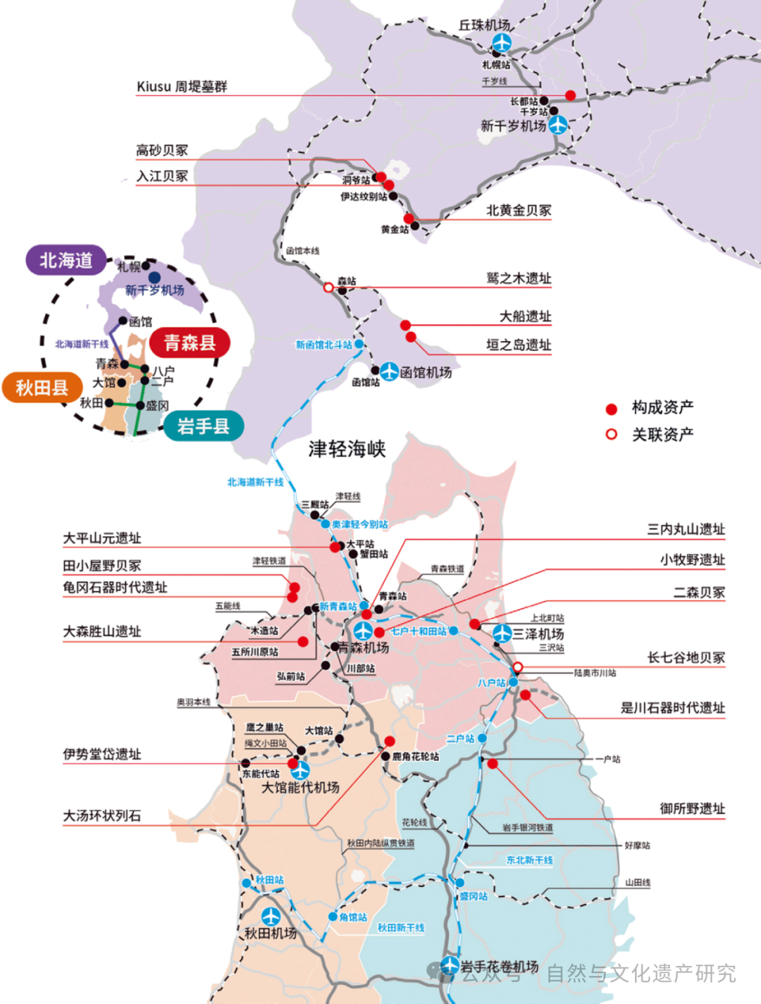 2021年7月27日,日本北海道、北东北的绳纹遗址群在第44届世界遗产大会上列入《世界遗产名录》。该绳纹遗址群“见证了进入农耕社会之前就已定居下来的绳纹文化及其复杂的精神信仰体系和仪式在过去10 000多年的发展过程……”,符合世界遗产价值标准(iii)和标准(v),分别为“见证了世界范围内罕见的以狩猎、捕鱼、采集为基础的史前定居社会,并孕育出通过足形的陶板、著名的遮光器土俑等考古遗物,以及墓地、弃物场、垫土、环状列石等考古遗迹展现出复杂的精神文化”和“是从定居出现、发展到成熟的聚落定居形态和土地利用的突出案例。绳纹人没有像农耕社会中看到的那样大规模改变土地,而是适应不断变化的气候,维持可持续性的狩猎、捕鱼、采集的生活方式……”[9];2项价值标准主要可归纳为如下4个特征:①展示出巧妙利用自然资源的生活方式;②通过祭祀、礼仪展示出精致而复杂的精神文化;③展示出聚落的选址与生业之间关系的多样性;④展示出聚落形态的变迁[10]。这些特征主要通过17处遗址作为构成资产和2处遗址作为关联资产而体现(图2)。