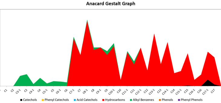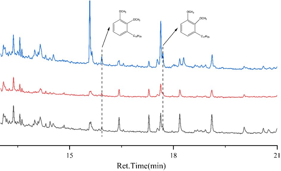 热裂解气相色谱质谱仪用于分析漆绘陶中的有机成分,分别取DS-1-红、DS-2-红和DS-2-黄三个样品进行实验,结果见图8。结果表明三个样品中含有较为相似的化合物,包括烷烃、烯烃、烷基苯、酚类、邻苯二酚和脂肪酸类物质,符合大漆的特征(以DS-1-红色样品为例的漆成分分布见图9)。且三个样品中的大漆均含有laccol漆种的典型裂解产物3-十七烷基邻苯二酚衍生物1,2-二甲氧基-3-十七烷基苯(m/z=376)。Laccol漆常被认为产于越南地区,故被称为越南漆。本研究中发现laccol漆,表明距今约五千多年时江苏常州地区生活的古人类已经认识并利用了Rhus succedanea树种。新石器时代晚期处于“全新世热盛期”(BP 8000–BP 4000),全新世中期时长江三角洲气候温暖湿润,在此气候条件下Rhus succedanea树可能生长在江苏地区。这也表明,中国极有可能也是越南漆的起源地之一。