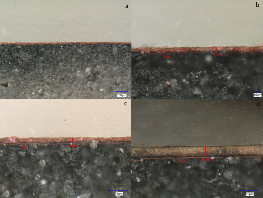 应用超景深三维视频显微镜对漆绘陶样品剖面进行观察,结果发现两件样品均有两层结构:打底层较薄,仅有3~5微米;红色颜料层厚度为12~13微米;黄色颜料层厚度相对较厚,为28微米。