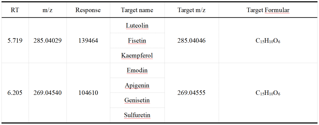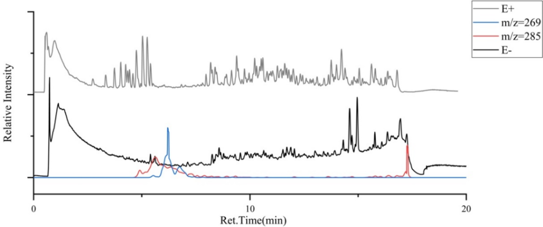 为了确定黄色染料的成分,将超高效液相色谱质谱仪应用于本样品,结果见图6。根据一级质谱筛选结果,存在m/z =269.04540和m/z =285.04029的化合物。因此,推测可能存在表2中的化合物。