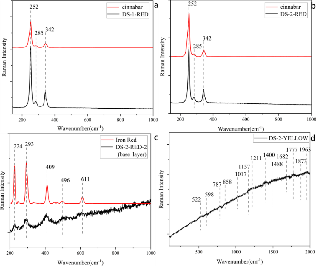 经过拉曼光谱分析(见图5),进一步证明了电镜的结果,即DS-1和DS-2表层红色颜料均为朱砂,底层红色颜料均为铁红;而DS-2-表层黄色颜料由于荧光效应较强,仅能测得较弱的信号峰,经过与中国古代传统黄色染料拉曼谱图进行对比,均匹配失败。
