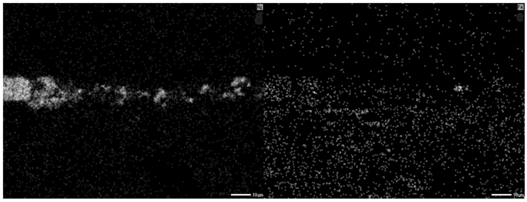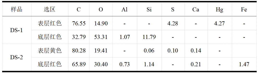 样品经过扫描电子显微镜及能谱仪分析,结果见表1。在DS-1的表层红色中,除碳和氧元素外,有等比例的硫和汞元素存在,故推测为朱砂;DS-1底层由于太薄(约3微米),难以测得其中的显色元素,故使用面扫模式(见图4),可观察到打底层中的铁元素,故推测其用铁红打底。在DS-2中,表层黄色中未见有效显色元素,故推测该黄色颜料为有机染料;DS-2底层红色中测得显色元素为铁,推测其用铁红打底。