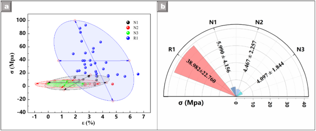 图3 (a)考古木材的抗弯强度-断裂应变及95%置信区间