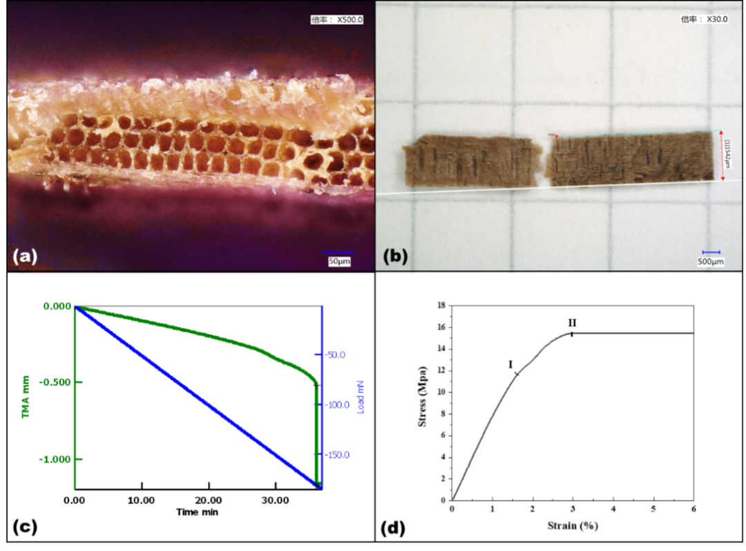 实验方法:采用Leica 2010R 平推式切片机制备厚度为0.3 mm的饱水考古木材径切面薄片,干燥后手工裁切为约10 mm×2 mm(L×R)的TMA抗弯试样。抗弯强度测试中,TMA使用石英弯曲探针和配套组件,如图1所示,跨距L为5 mm,初始载荷0.1 mN,加载速度5 mN/min,直至试样断裂(图2b),获得探针实时位移F-载荷曲线D(图2c)。利用VHX-6000超景深显微镜测量试样的宽度b和厚度d,精度为0.01 mm(图2a、b)。由公式1、2计算样品断裂时的抗弯强度σ和断裂应变ε,每组样品30个。应力应变曲线(图2d)中0~I为弹性形变区间,I~II为塑性形变区间,试样于点II时断裂。