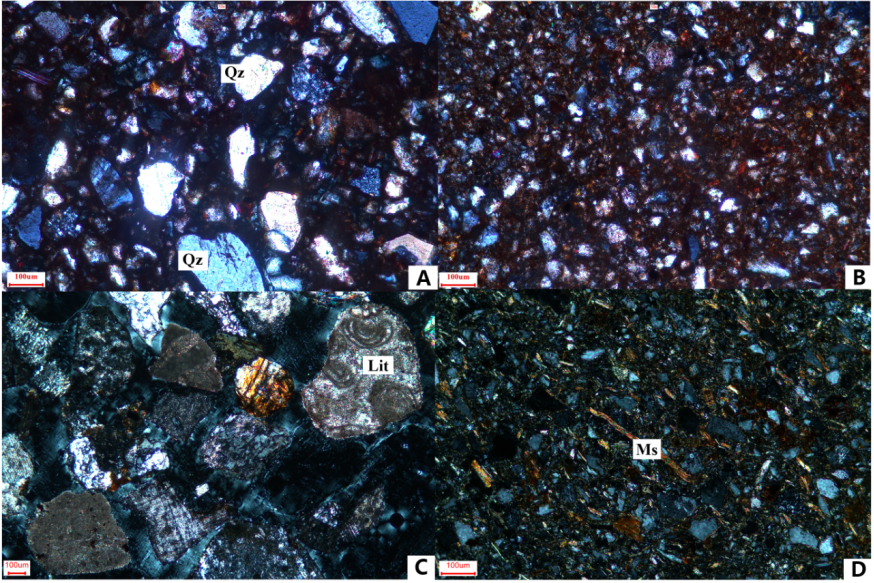 B组粉砂与粗砂比例高,矿物组成以石英、长石为主,仅存在少量细小云母颗粒(1-2%,<150μm)及重矿物(图4A),岩屑种类较少且风化严重。C组泥芯粒度偏细,以粉砂为主,黏土含量较高,砂含量较低。矿物组成与B组相似,未观察到岩屑(图4B)。B、C两组泥芯成分接近,均具有高Si低Ca的特征,后者K2O偏高可能与较多的黏土含量有关。