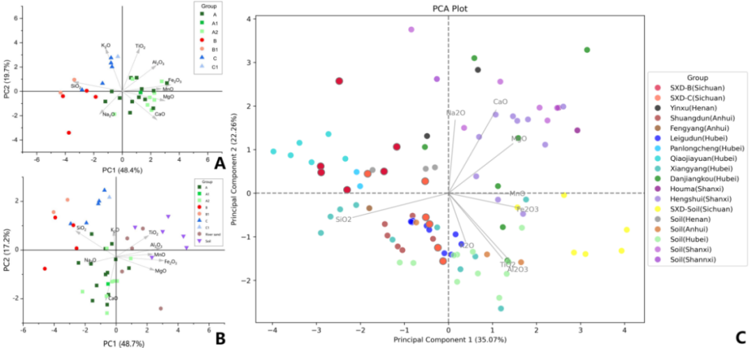 泥芯与土壤样品主量元素PCA散点图。(A.三星堆青铜器泥芯样品;B.三星堆泥芯与本地土壤河砂样品;C.商周时期中国主要铸铜作坊泥芯及土壤样品)