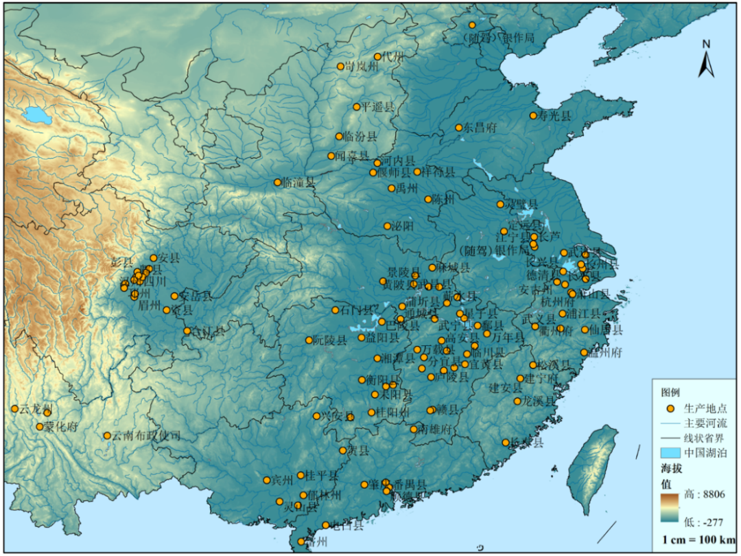 图一 已公布明代五十两税银银锭生产地点分布示意图