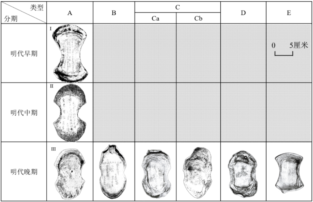 明代早期和中期银锭形制特征较为单一,A I和A II分别对应这两个时期的五十两银锭形制特征。明代晚期银锭类型较为丰富,同时包括A III、B、C、D、E五型,银锭的形制特征在明代呈现出单一到多样的演化,至明代晚期呈现鲜明的地域性特征(图三)。