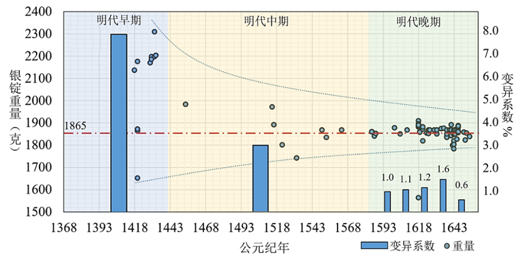 由于明代白银始终以称量货币的形式流通,重量和成色是衡量白银价值的实际尺度。依据已公布银锭重量和铭文中的铸造年代信息绘制图四,显示明代银锭重量的标准化程度随时间推移不断上升,最终稳定在五十两标准重量1865克附近。在白银货币化进程中,五十两银锭的重量监管趋于严格。
