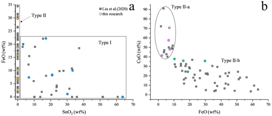 台家寺冶金渣共可分为两类。Ⅰ类冶金渣SnO2含量高,基体中可见大量锡石,赤铜矿和少量马来亚石晶体,在先秦铸铜遗址中较为常见,是配制或浇铸锡青铜时产生的遗物。Ⅱ类冶金渣则不含合金元素,根据CuO和FeO含量可再分为两组。Ⅱ-a类冶金渣的CuO>40 wt%,同时FeO<10 wt%,基体中可见大量赤铜矿和铜铁矿晶体,为熔炼或铸造红铜时形成。Ⅱ-b类冶金渣铜、铁含量与Ⅱ-a类相反,基体中可见大量磁铁矿晶体,有时可见浮氏体,为粗铜的精炼渣(图3-4)。铜片和铜簇均为锡青铜,金属基体部分的Cu含量在74 wt%以上,Sn含量在14 wt%以上,1件铜片中还含有1.6 wt%的Pb。