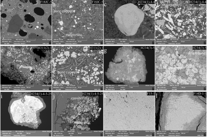 图 3 台家寺冶金微遗物与铜器显微照片。a-b:精炼渣,c-d:合金化渣,e-h:熔铜渣,i-j:铜颗粒,k-l:铜器