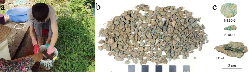 图 2 a:台家寺遗址灰坑填土重选,b:冶金微遗物,c:铜片与铜簇
