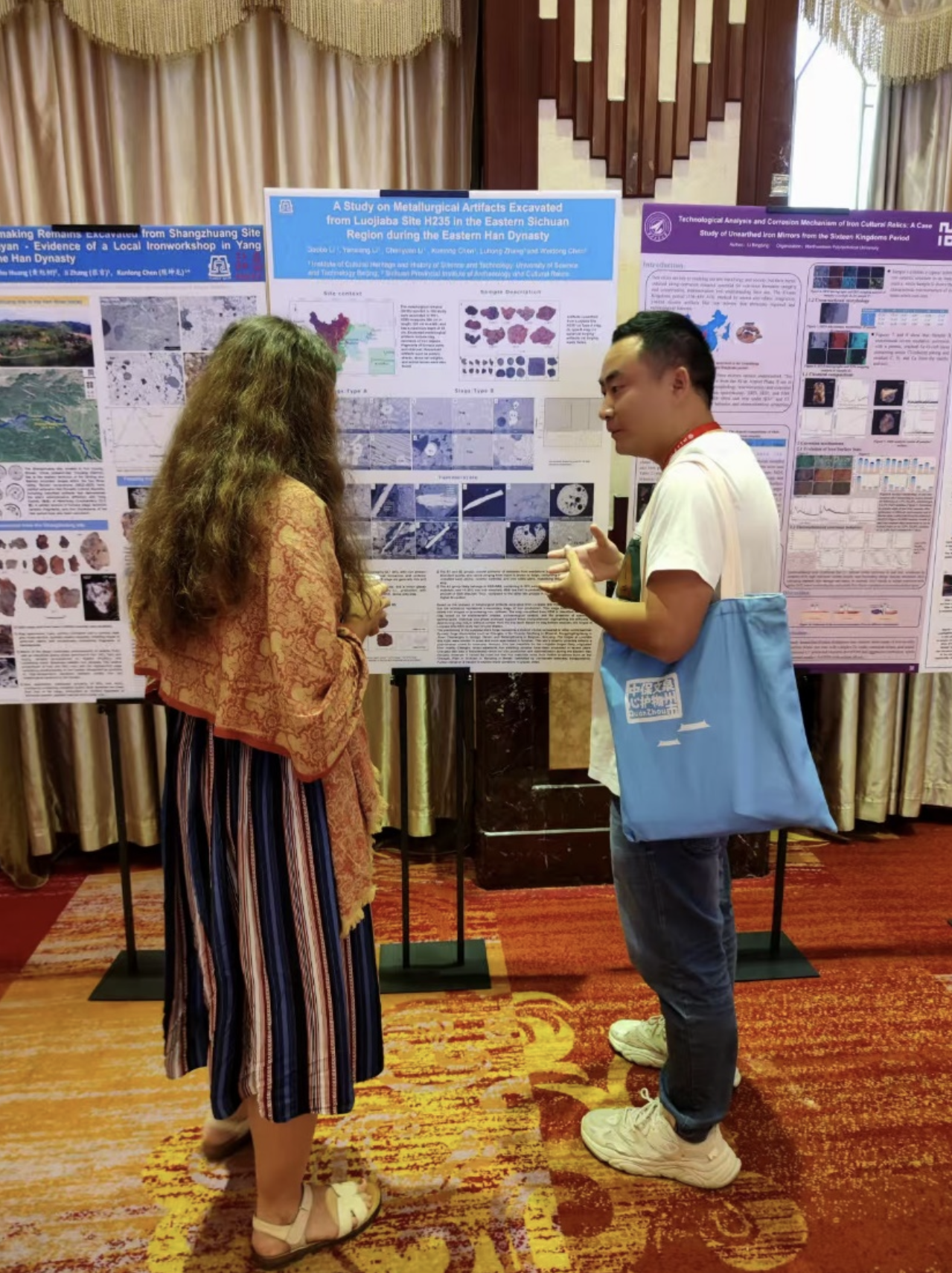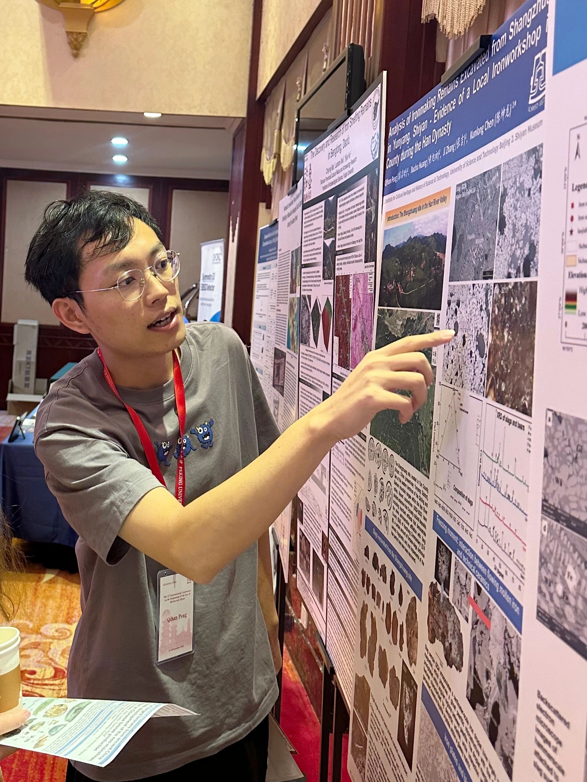 彭启晗博士研究生海报主题为《Analysis of Ironmaking Remains Excavated from Shangzhuang Site in Yunyang,Shiyan-Evidence of a Local Iron workshop in Yang County during the Han Dynasty》,介绍了湖北省十堰市郧阳区上庄遗址出土汉代炉渣、铁片等的实验分析结果,指出这些遗存应与炒钢生产有关,显示位于汉水中游河谷的汉代钖县地区存在小规模制铁手工业。