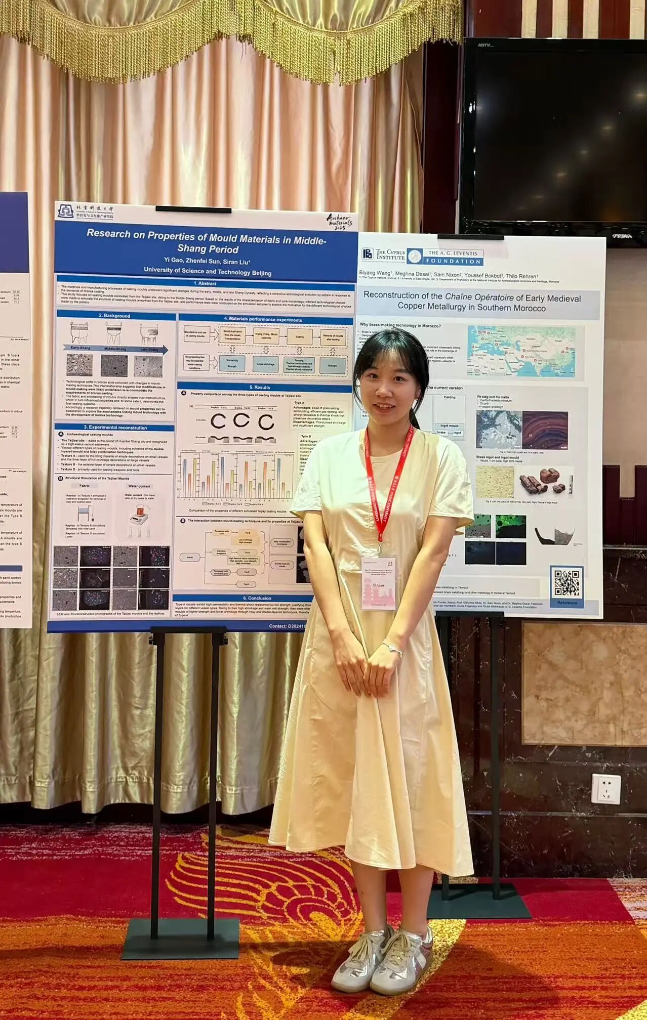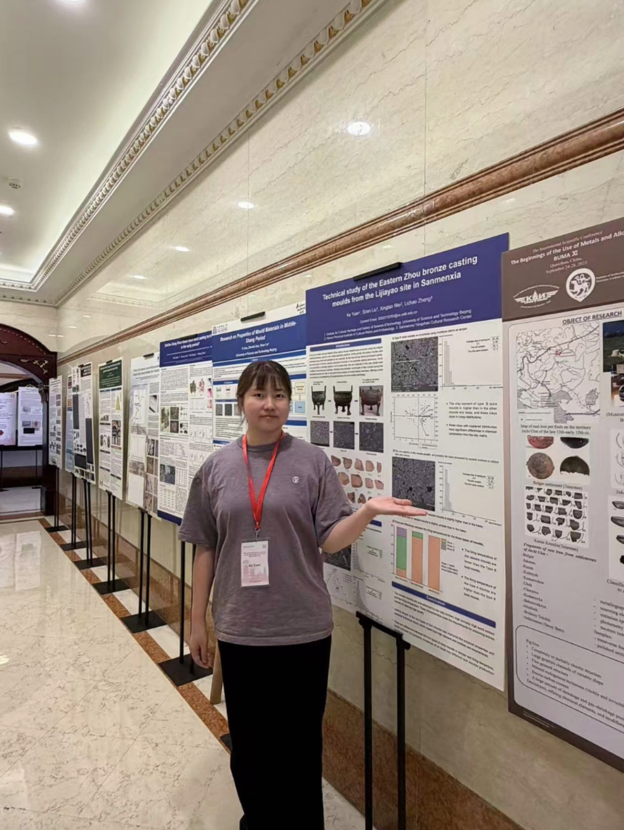 高祎博士研究生海报主题为《Research on Properties of Mould Materials in Middle-Shang Period》,以中商时期台家寺遗址出土陶范为参考对象,通过对模拟样品进行性能比较,从性能的角度探究工匠进行不同技术选择的原因。