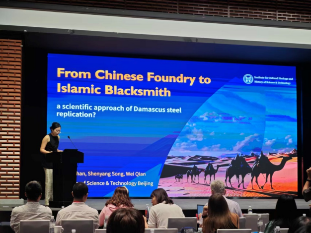 在铁器科学分析分论坛,单默昆博士研究生作题为《从中国铸造厂到伊斯兰铁匠铺——大马士革钢复原的科学研究》的报告,通过复原实验证实,利用生熟铁合炼的工艺制备大马士革钢有一定可行性,这为古代中国生铁出口以及跨文明技术交流提供了科学依据。