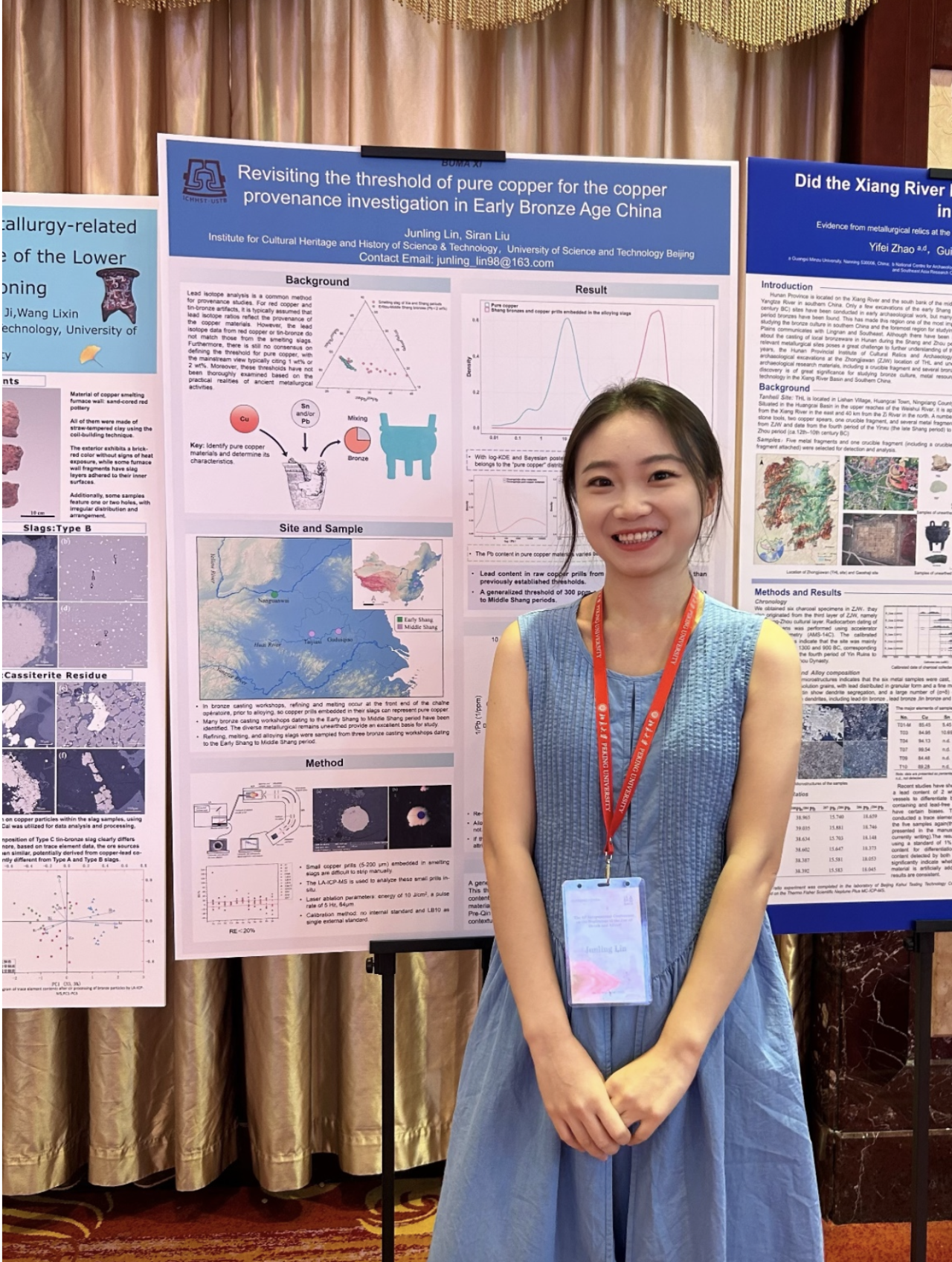 林俊伶博士研究生海报主题为《Revisiting the threshold of pure copper for the copper provenance investigation in Early Bronze Age》,研究以早商至中商时期三处铸铜遗址出土的精炼渣与熔铜渣中所含铜颗粒作为纯铜物料代表,通过系统比较纯铜物料与合金产品中的铅含量,确定了适用于青铜时代早期纯铜物料判别的铅含量阈值。