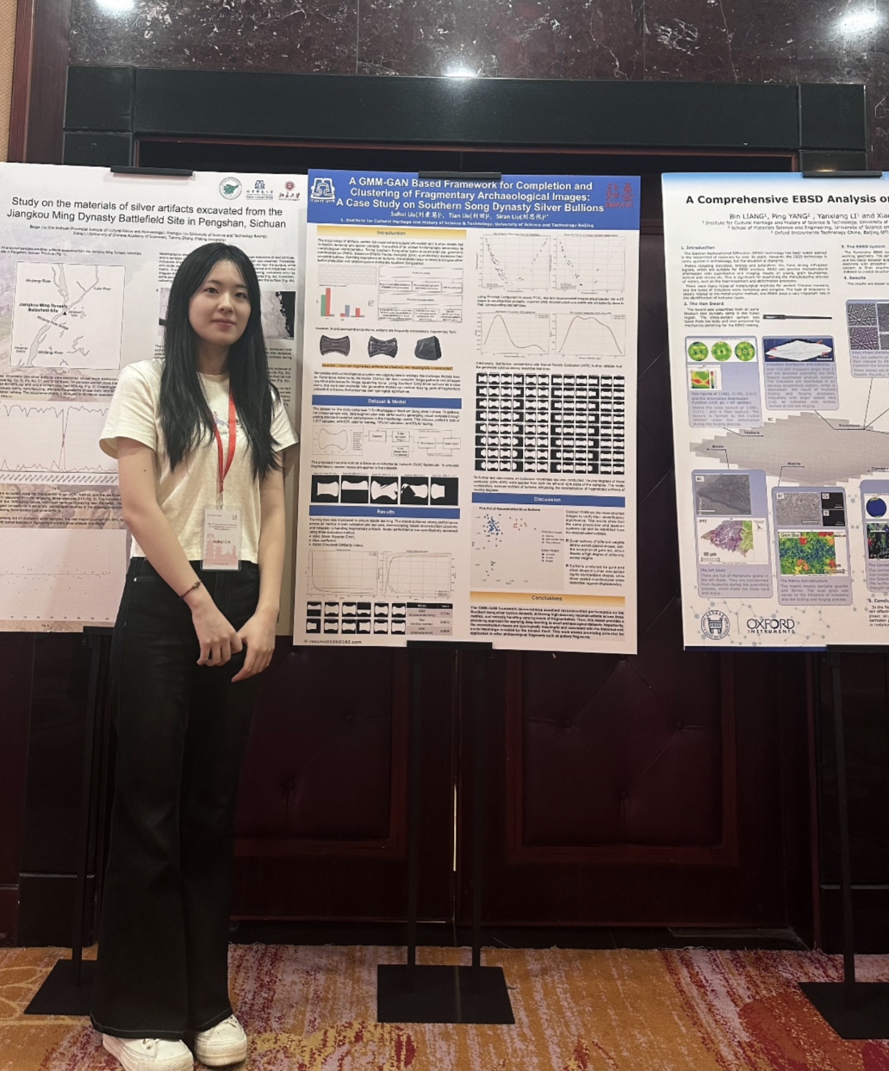 刘素慧硕士研究生海报主题为《A GMM-GAN Based Framework for Completion and Clustering of Fragmentary Archaeological Images: A Case Study on Southern Song Dynasty Silver Bullions》,通过结合几何形态测量学和生成对抗网络对南宋银铤数据集进行残缺文物模拟补全研究,结果显示重建的形状精确,同时有分类意义,与数据集所揭示的南宋银铤生产制度规律一致。