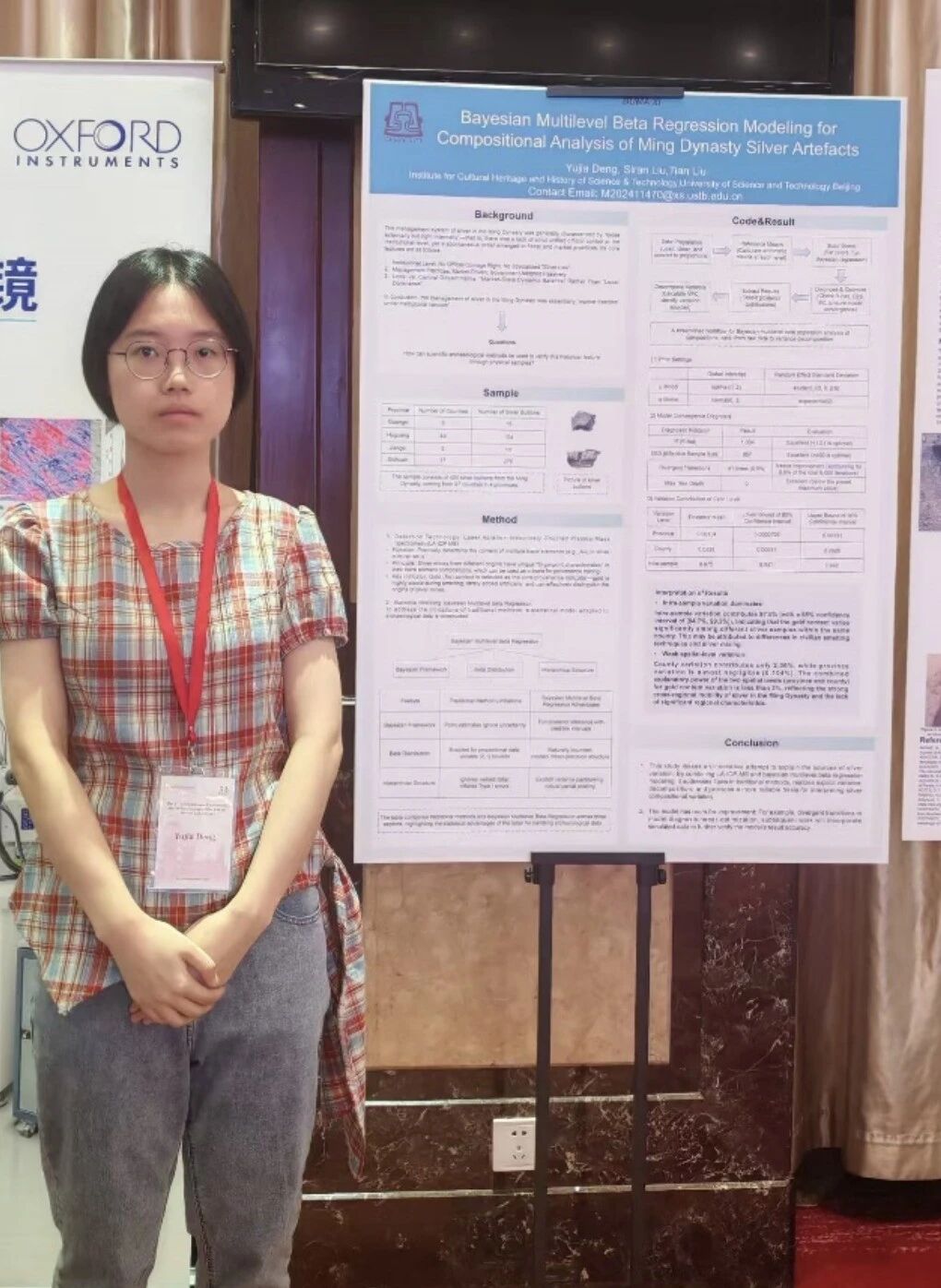 邓雨佳硕士研究生的海报主题为《Bayesian Multilevel Beta Regression Modeling for Compositional Analysis of Ming Dynasty Silver Artefacts》,通过结合LA-ICP-MS检测技术与贝叶斯多层次贝塔回归模型,对明代银器的成分变异来源进行量化分析,揭示了样本内变异占主导,而省、县层级空间变异极低,反映出明代白银在市场中具有高度流动性,缺乏严格官方管控的历史特征。
