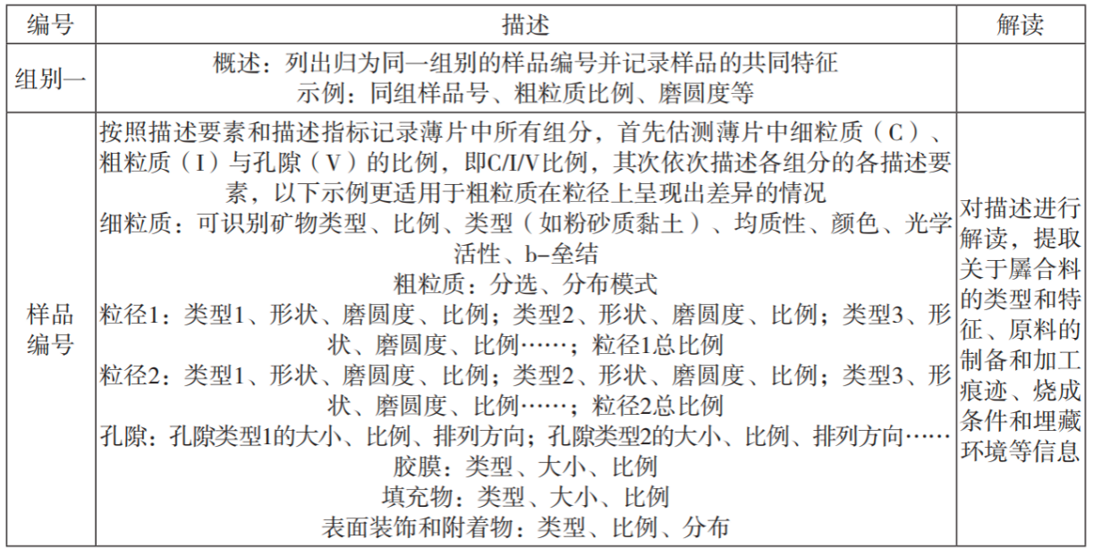 陶器岩相分析是揭示古代陶器原料来源、制作工艺及流通的重要方法,其基础在于对薄片进行系统详细的描述。基于对岩相分析基本原理与描述要素的梳理,本文构建了一个适用于中文语境的岩相特征描述体系,该体系不仅旨在提升描述的客观性、精确性与研究间的可比性,也通过对细粒质、粗粒质、孔隙、表面装饰及附着物等关键要素的细致观察,帮助系统解读陶器成型、烧成、原料选择及埋藏环境等信息。更重要的是,这种标准化为未来实现大规模数据整合、共享以及构建陶器岩相数据库奠定了坚实基础,有助于更可靠地识别跨区域、跨时代的工艺传统与流通模式。