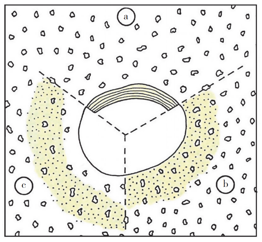 (5)填充物:孔隙中含有植物残骸和碳酸钙、石膏等易受埋藏环境变化影响的物质。填充物指示羼合料以及埋藏环境的性质和变化。